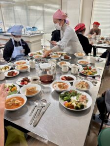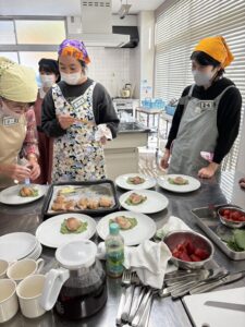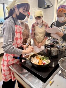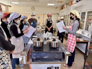 参加者のみなさんは、先生の説明をメモを取りながら熱心に聞き、質問などもされながら和気あいあいと協力しながら調理をされていました。